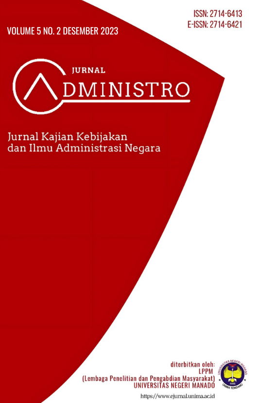 Vol. 4 No. 1 (2022)Administro, Jurnal Kajian Kebijakan dan Ilmu Administrasi Negara merupakan Jurnal Ilmiah yang diterbitkan oleh Lembaga Penelitian dan Pengabdian Kepada Masyarakat (LPPM) Universitas Negeri Manado. Jurnal ini diterbitkan 2 (dua) kali setahun yaitu pada bulan Juni dan Desember. Jurnal ini merupakan kumpulan artikel hasil Penelitian di bidang Kajian Kebijakan dan Ilmu Administrasi Negara. Artikel yang dimuat adalah yang belum pernah diterbitkan oleh jurnal lain. Artikel yang dimuat bisa ditulis dalam Bahasa Indonesia maupun Bahasa Inggris.