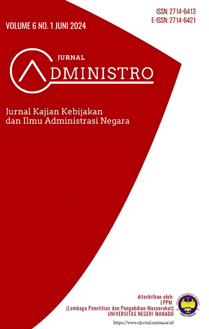Vol. 3 No. 1 (2021)Administro, Jurnal Kajian Kebijakan dan Ilmu Administrasi Negara merupakan Jurnal Ilmiah yang diterbitkan oleh Lembaga Penelitian dan Pengabdian Kepada Masyarakat (LPPM) Universitas Negeri Manado. Jurnal ini diterbitkan 2 (dua) kali setahun yaitu pada bulan Juni dan Desember. Jurnal ini merupakan kumpulan artikel hasil Penelitian di bidang Kajian Kebijakan dan Ilmu Administrasi Negara. Artikel yang dimuat adalah yang belum pernah diterbitkan oleh jurnal lain. Artikel yang dimuat bisa ditulis dalam Bahasa Indonesia maupun Bahasa Inggris.