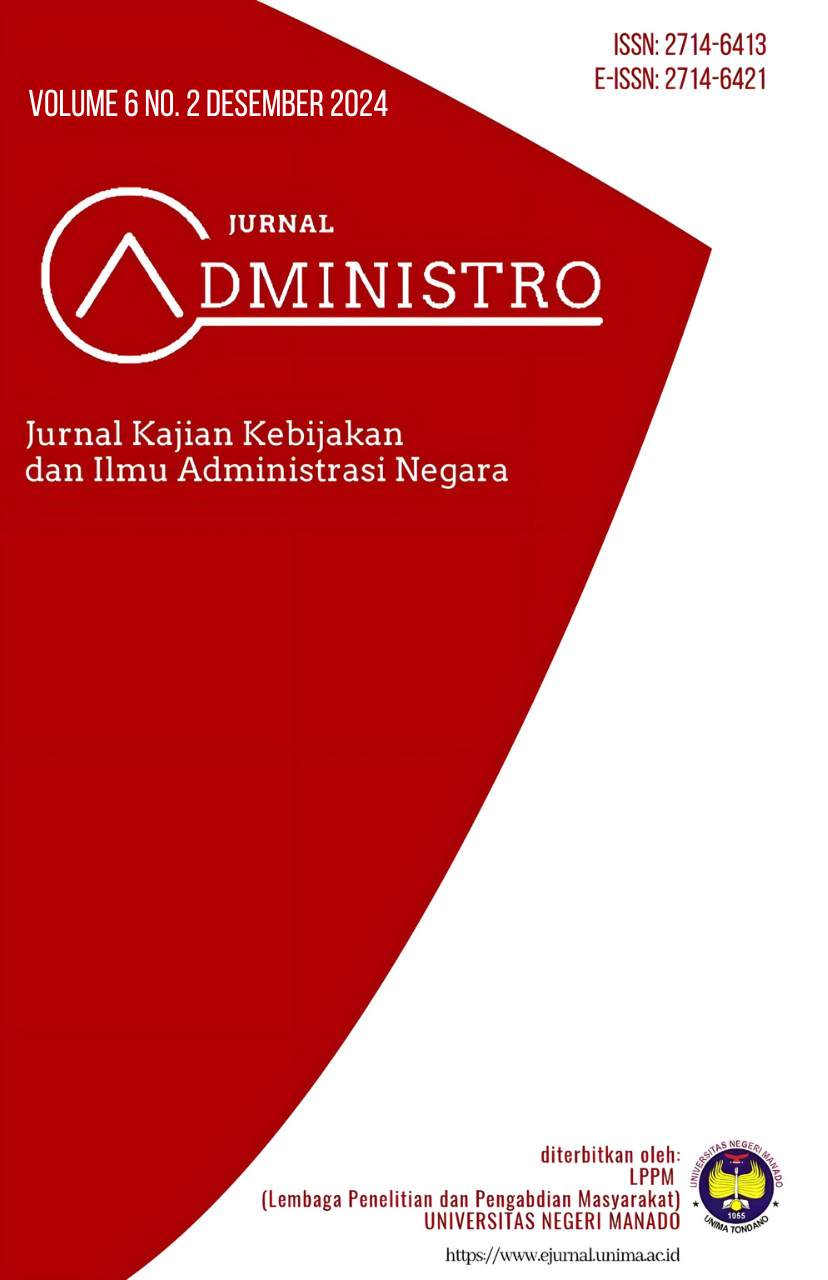 Vol. 2 No. 1 (2020)Administro, Jurnal Kajian Kebijakan dan Ilmu Administrasi Negara merupakan Jurnal Ilmiah yang diterbitkan oleh Lembaga Penelitian dan Pengabdian Kepada Masyarakat (LPPM) Universitas Negeri Manado. Jurnal ini diterbitkan 2 (dua) kali setahun yaitu pada bulan Juni dan Desember. Jurnal ini merupakan kumpulan artikel hasil Penelitian di bidang Kajian Kebijakan dan Ilmu Administrasi Negara. Artikel yang dimuat adalah yang belum pernah diterbitkan oleh jurnal lain. Artikel yang dimuat bisa ditulis dalam Bahasa Indonesia maupun Bahasa Inggris.