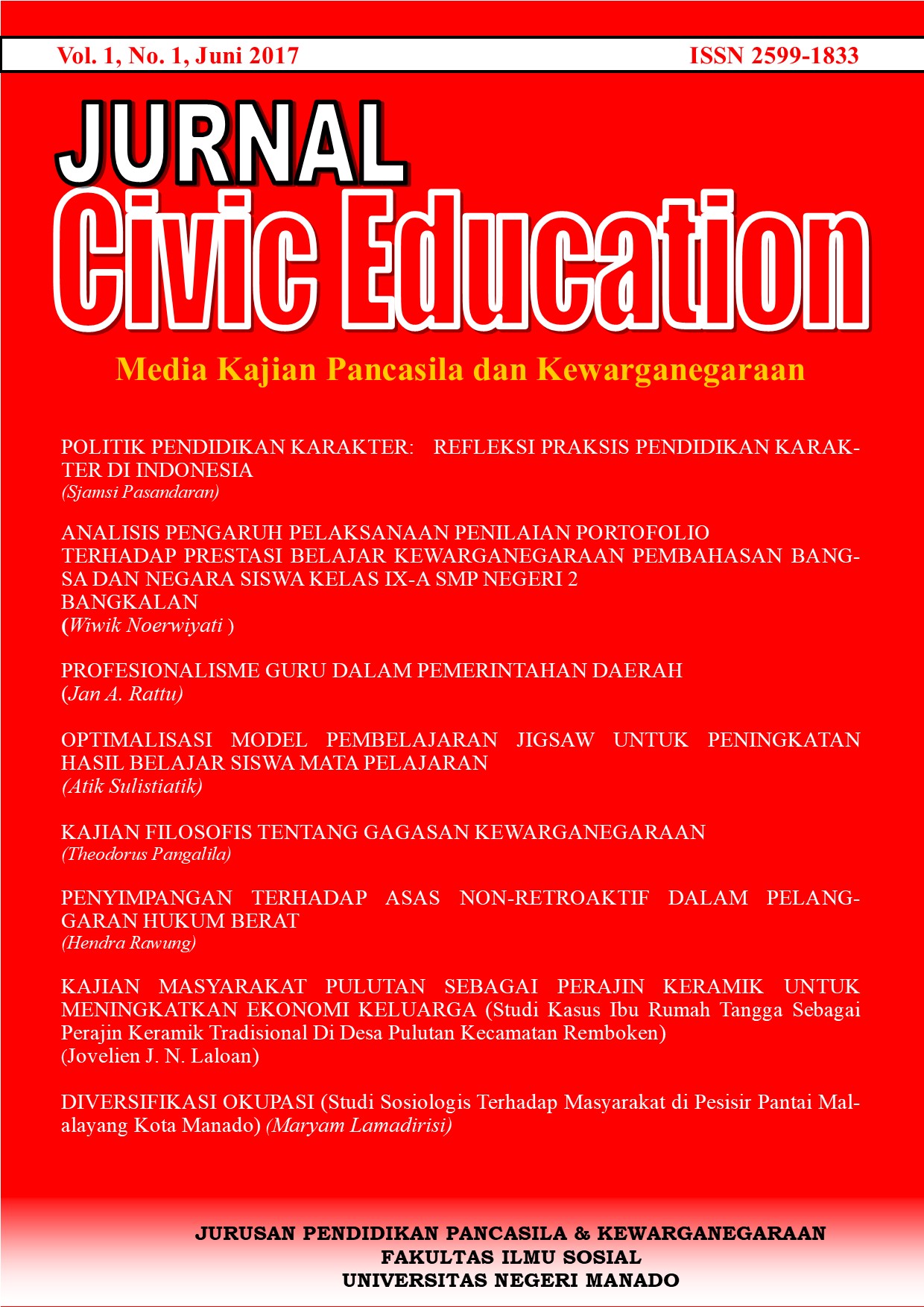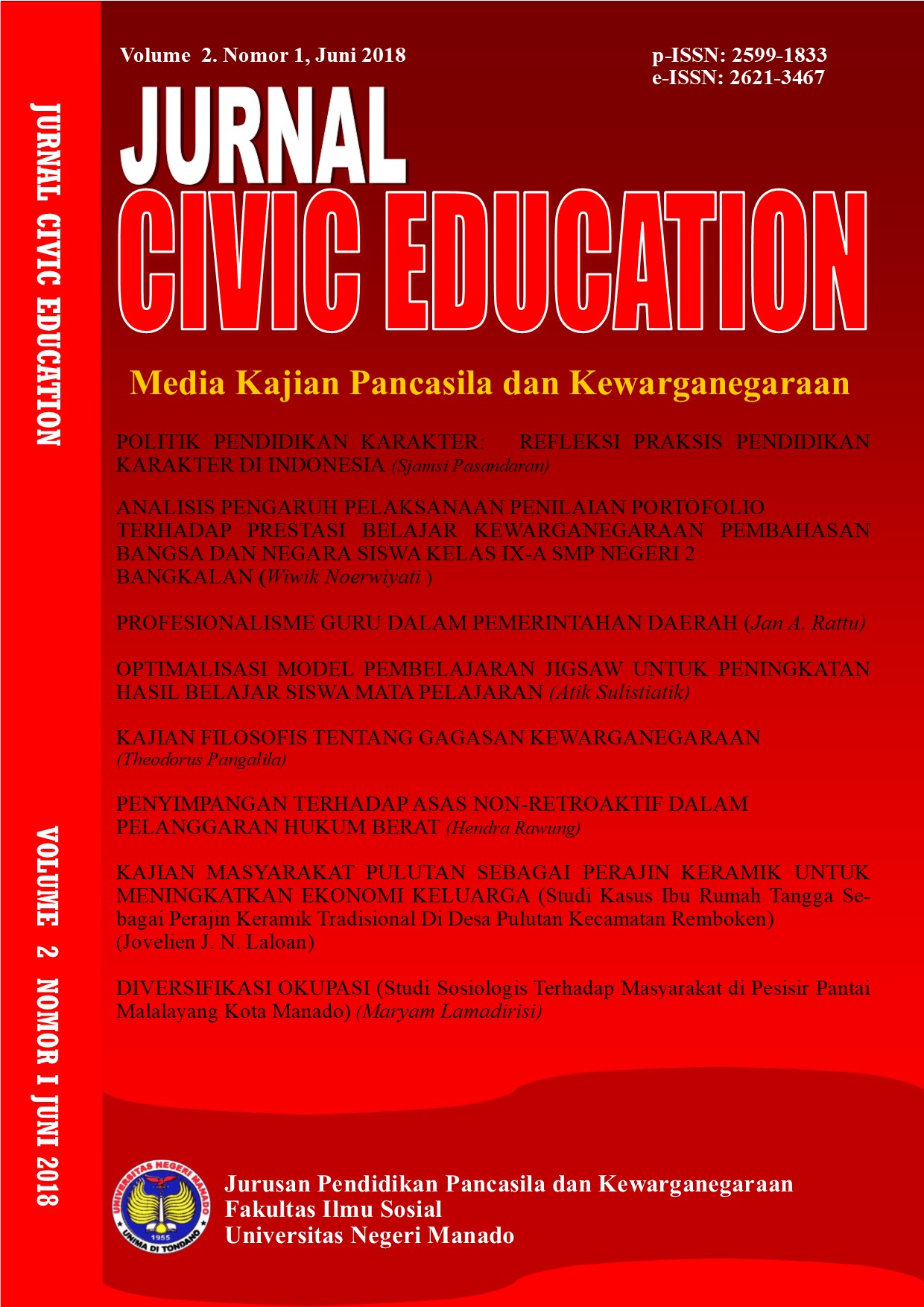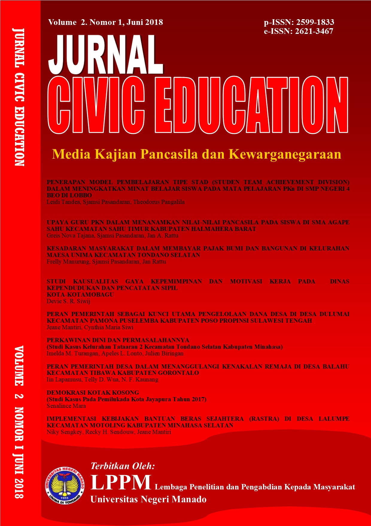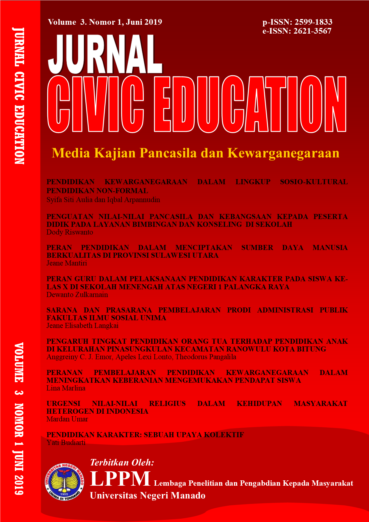 Jurnal Civic Education Media Kajian Pancasila (JCE) dan Kewarganegaraan is published by Pancasila and Civic Education Department and LPPM, Manado State University in collaboration with Asosiasi Profesi Pendidikan Pancasila dan Kewarganegaraan Indonesia (Indonesia Association Profession of Pancasila and Civic Education/AP3KnI).