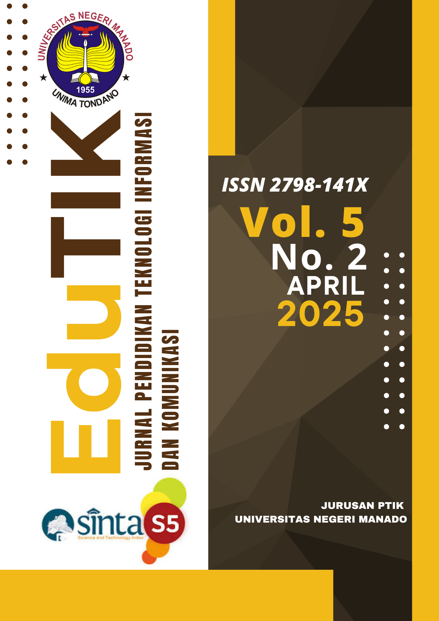 Vol. 5 No. 3 (2025)Jurnal Edutik adalah jurnal nasional terakreditasi SINTA 5 yang berfokus pada teori, metodologi maupun praktikum dari seluruh aspek teknologi khususnya yang berhubungan dengan ilmu komputer, teknik informatika, sistem informasi, pendidikan teknologi informasi, teknologi komunikasi serta ilmu komunikasi. Edutik diterbitkan enam kali dalam satu tahun oleh Jurusan Teknologi Informasi dan Komunikasi Fakultas Teknik Universitas Negeri Manado.